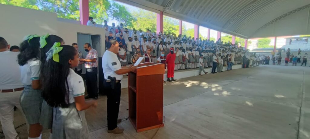 Acapulco, Gro., 10 de octubre de 2022.*- Con el objetivo de fomentar la cultura cívica, reafirmar la proximidad social entre alumnos y autoridades, el Gobierno Municipal, a través de la Secretaría de Seguridad Pública (SSP), puso en marcha el programa “La Policía en mi Escuela”, en la Secundaria número 8 “Benemérito de las Américas”.