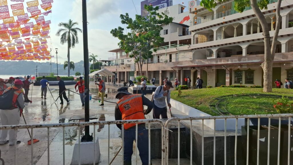 Acapulco, Gro., 31 de octubre de 2025.- Para conservar en óptimas condiciones el primer cuadro de la ciudad y ofrecer una imagen ordenada a residentes y visitantes, la Coordinación General de Servicios Públicos implementó una brigada especial de limpieza en el Zócalo.
