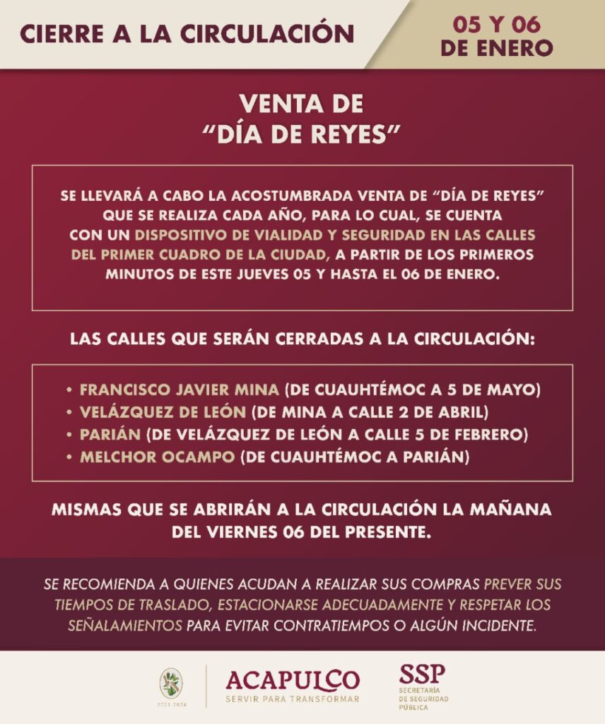 Acapulco, Gro., 04 de enero de 2023.– Debido a la celebración del “Día de Reyes”, a partir de los primeros minutos del jueves 05, hasta la mañana del 06 de enero, la Secretaría de Seguridad Pública (SSP), contará con un dispositivo de vialidad, que cerrará a la circulación, calles del primer cuadro de la ciudad.