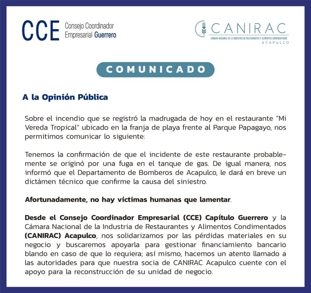 El CCEGro subrayó que no hay víctimas humanas que lamentar e hizo un llamado a las autoridades para que, la dueña del restaurante, cuente con apoyo para la reconstrucción de su negocio.