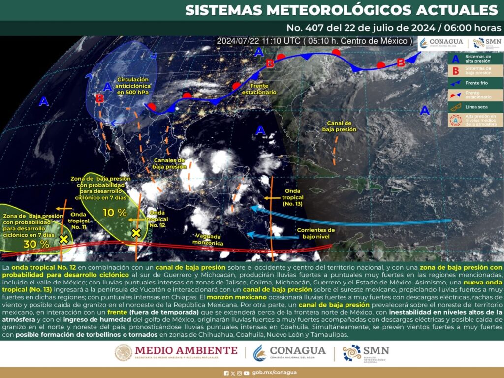 De acuerdo con el reporte vespertino del Servicio Meteorológico Nacional (SMN), un canal de baja presión sobre el occidente y centro del territorio nacional, en combinación con el aporte de humedad generado por una zona de baja presión con probabilidad para desarrollo ciclónico, asociada a la onda tropical número 12, localizada frente a las costas del Pacífico central mexicano, producirán lluvias puntuales intensas en Guerrero.
