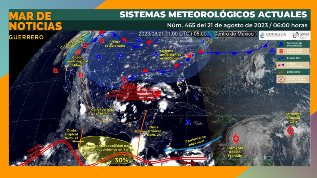 En el reporte matutino que emite el Servicio Meteorológico Nacional (SMN), indica que este lunes la onda tropical número 24 se desplazará sobre el sureste mexicano, que en interacción con la entrada de humedad del golfo de México y mar del Caribe, así como una zona de baja presión con probabilidad ciclónica sobre el noreste del golfo de México, además de la presencia del monzón mexicano sobre el noroeste del país y un canal de baja presión que se extenderá sobre el norte, occidente y centro del territorio mexicano, ocasionarán lluvias fuertes en Guerrero.