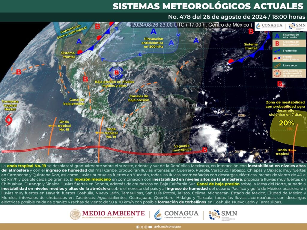 De acuerdo con el reporte de la coordinación, la onda tropical número 19 se desplazará sobre el sureste, oriente y gradualmente el sur de la República Mexicana, en interacción con inestabilidad en niveles altos de la atmósfera y el ingreso de humedad del mar Caribe, generarán las precipitaciones.