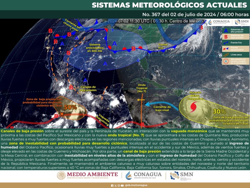 El Servicio Meteorológico Nacional (SMN), informa que se reporta una zona de inestabilidad con probabilidad para desarrollo ciclónico al sur de las costas de Guerrero, aunado al ingreso de humedad del Océano Pacífico.