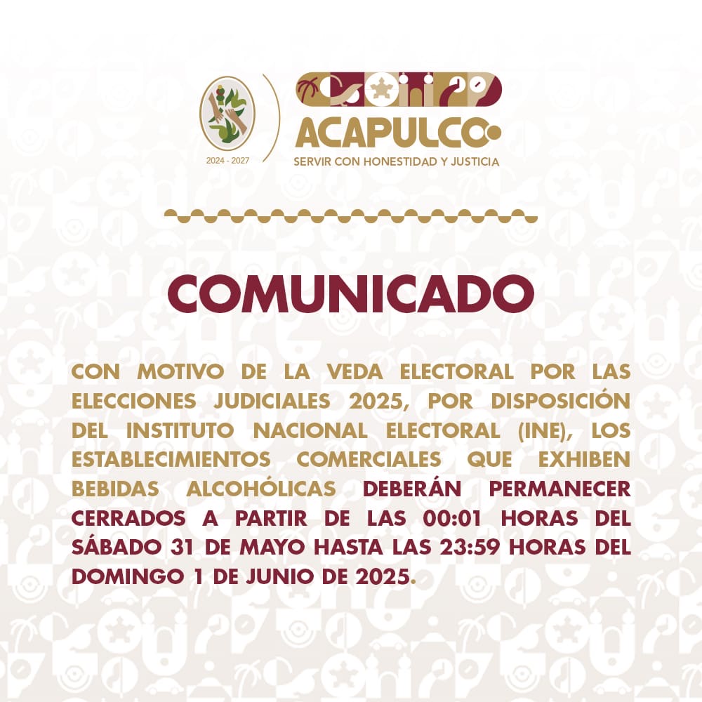 Acapulco, Gro., 29 de mayo de 2025.- El Gobierno Municipal que encabeza la Presidenta, Abelina López Rodríguez, informa a la ciudadanía, propietarios o encargados de establecimientos comerciales que expenden bebidas alcohólicas en cualquiera de sus modalidades, sobre la aplicación de la veda electoral con motivo de la elección judicial 2025.