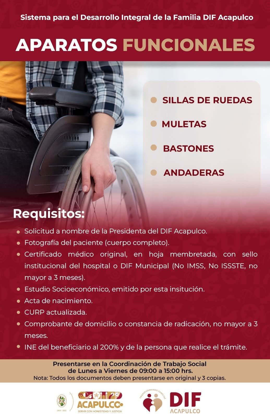 La recepción de documentos corresponde a solicitudes de sillas de ruedas estándar, PCA o PCI, andaderas, bastones y muletas. Las personas interesadas pueden acudir al edificio central del DIF Acapulco, ubicado en la calle Río Grande y Mercado s/n, colonia Hogar Moderno, de lunes a viernes, en horario de 9:00 a 15:00 horas.