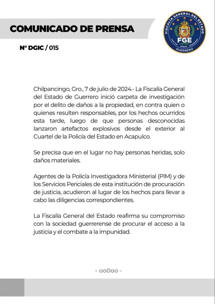 Chilpancingo, Gro., 7 de julio de 2024.- La Fiscalía General del Estado de Guerrero inició carpeta de investigación por el delito de daños a la propiedad, en contra quien o quienes resulten responsables, por los hechos ocurridos esta tarde, luego de que personas desconocidas lanzaron artefactos explosivos desde el exterior al Cuartel de la Policía del Estado en Acapulco.