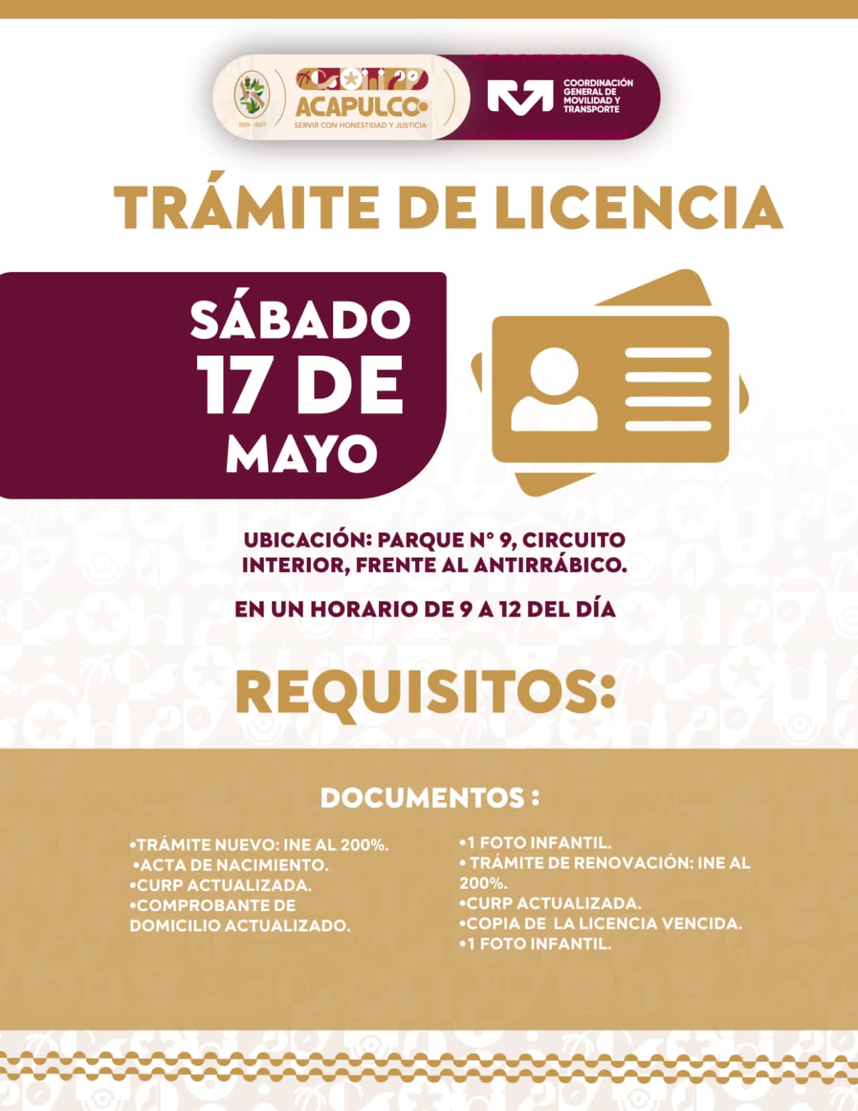 Acapulco, Gro., 16 de mayo de 2025.- El Gobierno Municipal de Acapulco que preside Abelina López Rodríguez a través de la Coordinación General de Movilidad y Transporte invita a la población a la jornada de trámites de licencia de conducir, que se realizará este sábado 17 de mayo.