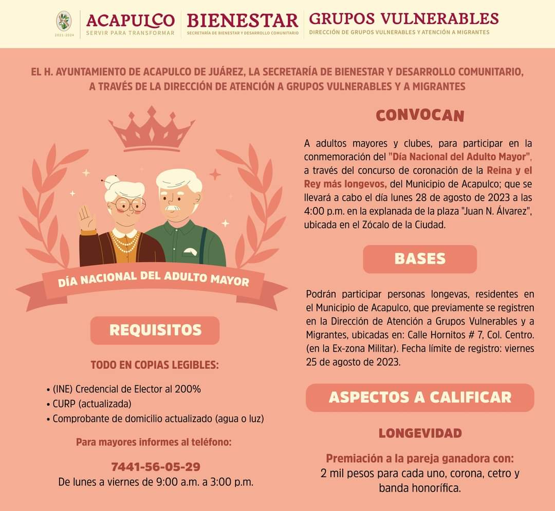 El evento se realizará el 28 de agosto a las 16:00 horas en el Zócalo de Acapulco. Las y los interesados en participar en ambos eventos deberán tener la edad de 60 años en adelante, asimismo deberán presentar copias fotostáticas de la identificación oficial (INE) al 200 por ciento con domicilio del municipio, CURP actualizada y comprobante de domicilio actualizado (agua o luz).