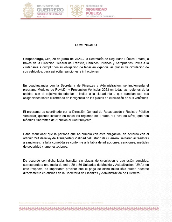 Chilpancingo, Gro, 20 de junio de 2023.- La Secretaría de Seguridad Pública Estatal, a través de la Dirección General de Tránsito, Caminos, Puertos y Aeropuertos, invita a la ciudadanía a cumplir con su obligación de tener en vigencia las placas de circulación de sus vehículos, para así evitar sanciones e infracciones.