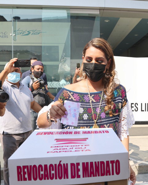 Luego de casi una hora de estar formada en la larga fila, en la casilla especial que se instaló en la central de autobuses, Salgado Pineda ejerció su voto sobre la revocación de mandato del actual presidente Andrés Manuel López Obrador.