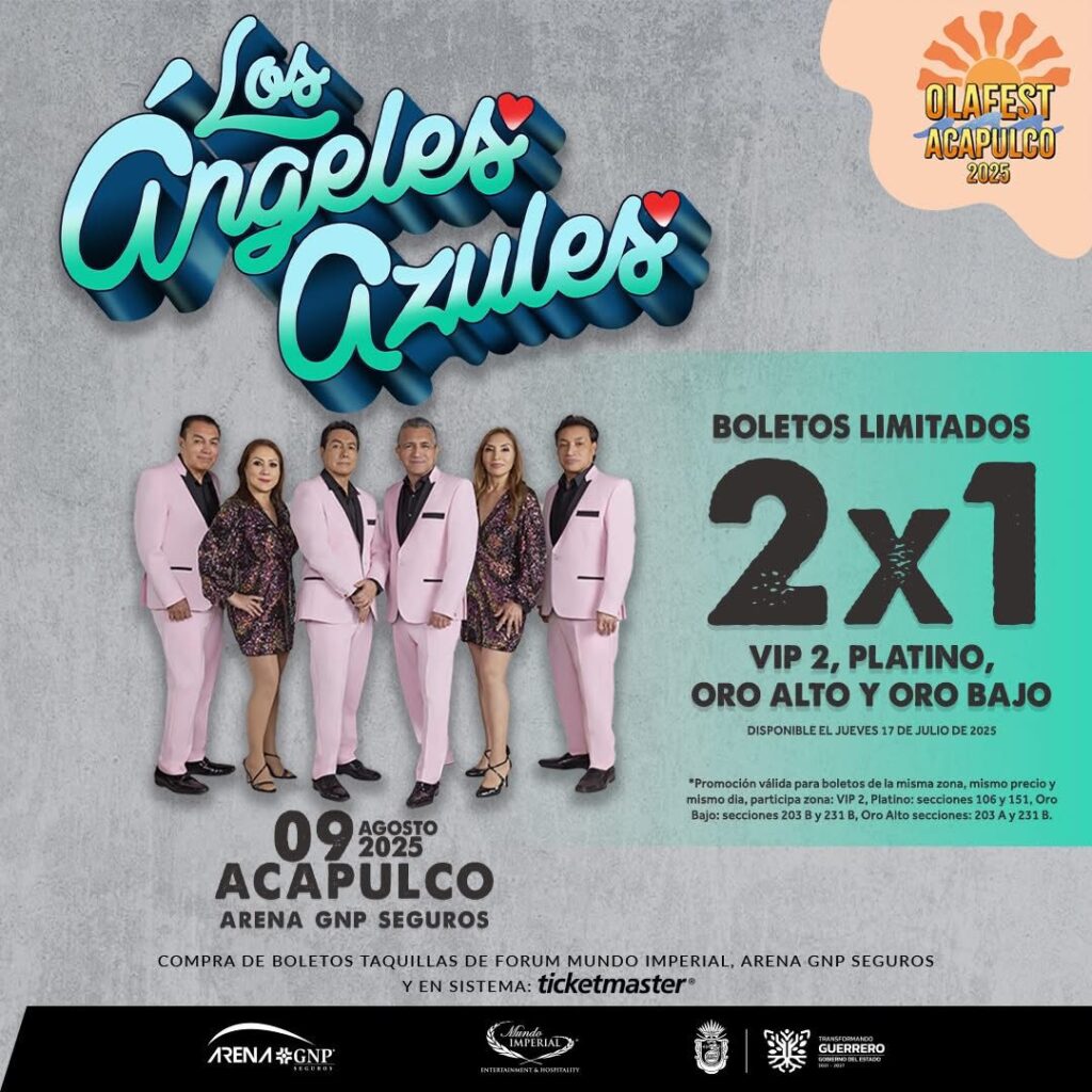 Acapulco, Gro., 7 de agosto de 2025.- El ritmo, la fiesta y la alegría del verano alcanzarán su punto más alto este sábado 9 de agosto, cuando Los Ángeles Azules lleguen a Acapulco para hacer vibrar la Arena GNP Seguros en el espectacular cierre del OLA Fest 2025, evento impulsado por la gobernadora Evelyn Salgado Pineda a través de la Secretaría de Turismo del Estado.