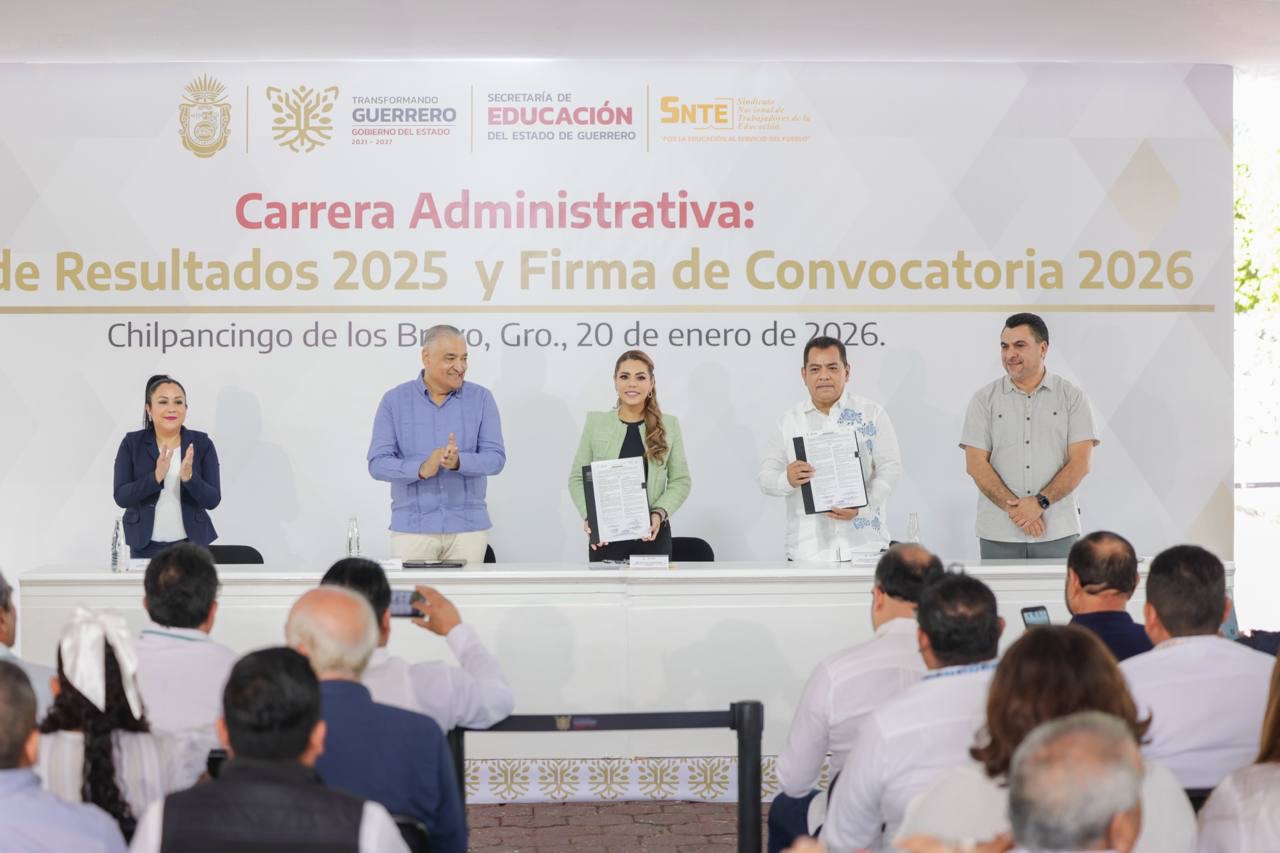 Chilpancingo, Gro., 20 de enero de 2026.- “La herramienta más poderosa que tenemos para transformar a Guerrero, a México y al mundo es la educación”, afirmó la gobernadora Evelyn Salgado Pineda al firmar la convocatoria del Programa de Carrera Administrativa 2026, con el que se fortalece el salario base del personal de apoyo y asistencia a la educación básica en la entidad.