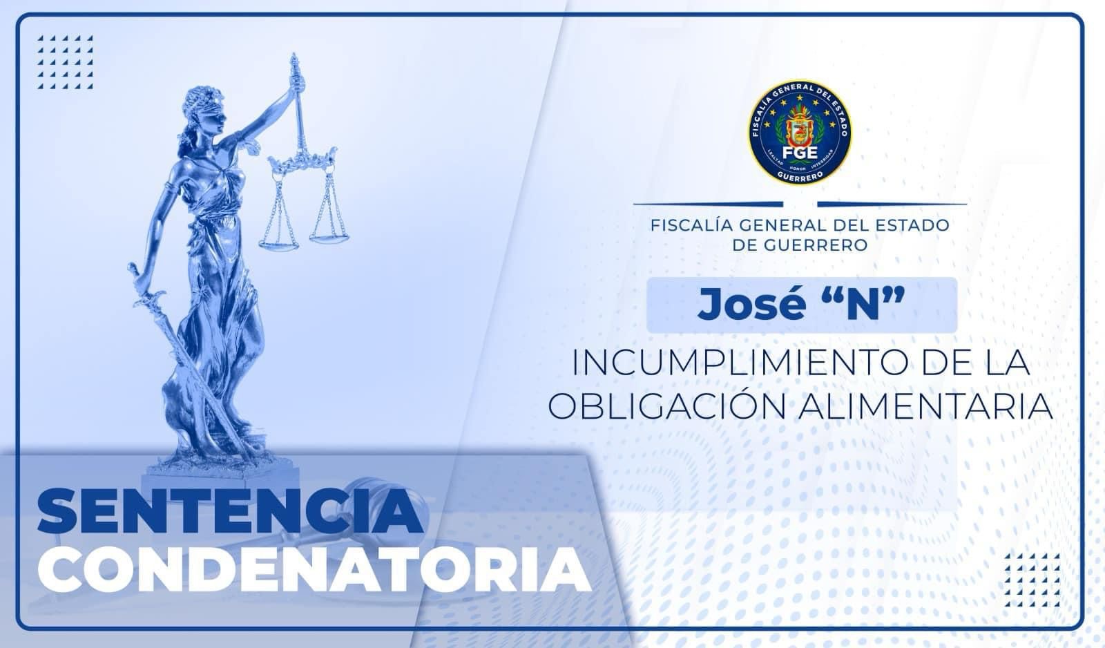 Chilpancingo Gro., a 12 de abril de 2024.- La Fiscalía General del Estado, logró que un Juez dictara sentencia condenatoria de 1 año y 6 meses de prisión en contra de José “N”, por el delito de Incumplimiento de la obligación alimentaria, cometido en perjuicio de una víctima menor de edad cuya identidad se reserva, por los hechos ocurridos en Chilpancingo de los Bravo.
