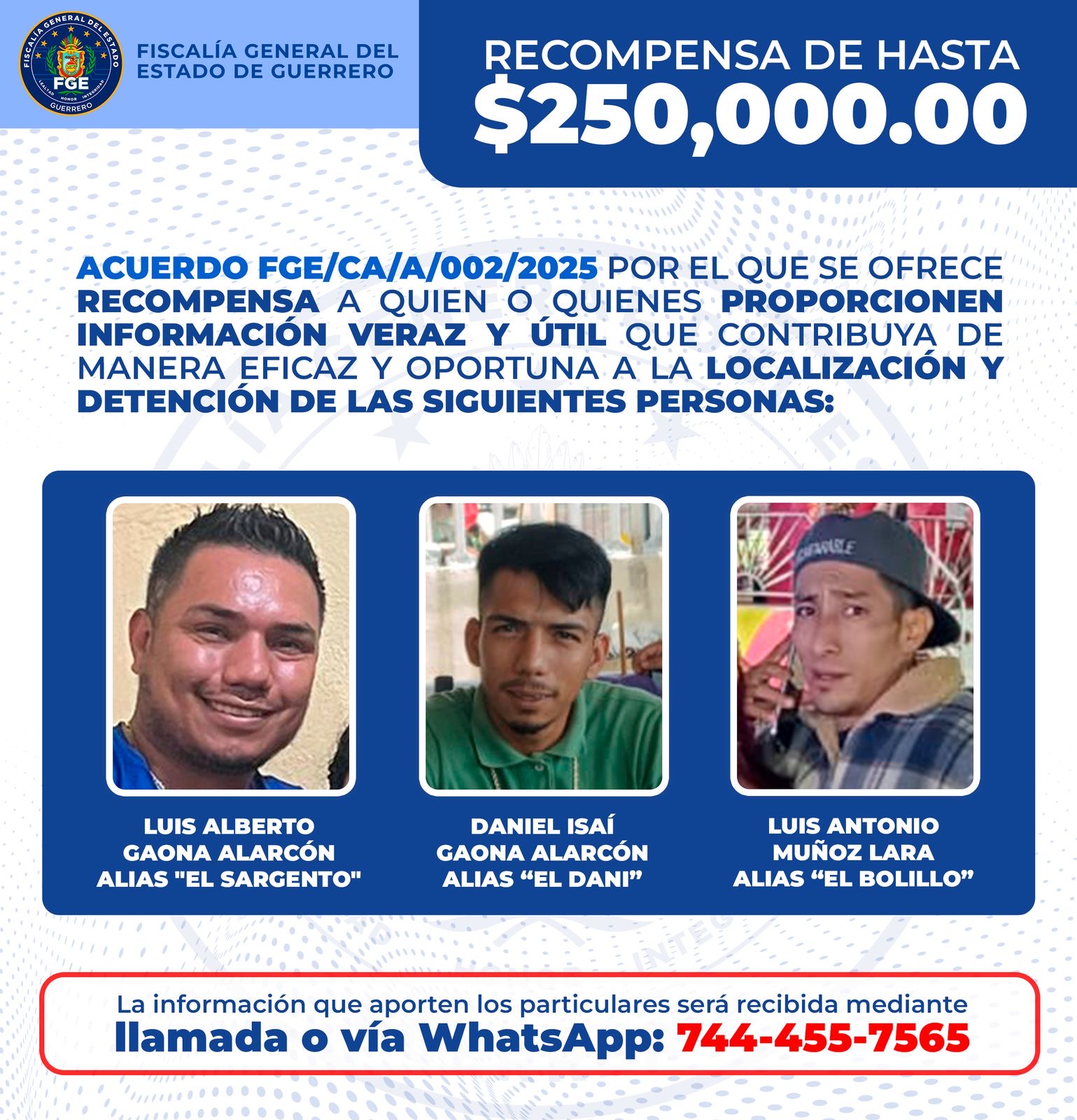 Chilpancingo, Gro., a 1 de mayo de 2025. — La Fiscalía General del Estado de Guerrero (FGE Guerrero) informa que, como parte de las acciones encaminadas a garantizar la procuración de justicia y combatir la impunidad, ofrece recompensa a quien o quienes proporcionen información veraz y útil que permita la localización y detención de tres individuos vinculados con el delito de homicidio en el municipio de Acapulco.