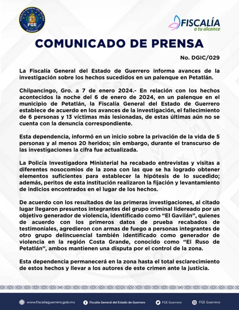 Chilpancingo, Gro. a 7 de enero 2024.- En relación con los hechos acontecidos la noche del 6 de enero de 2024, en un palenque en el municipio de Petatlán, la Fiscalía General del Estado de Guerrero establece de acuerdo en los avances de la investigación, el fallecimiento de 6 personas y 13 víctimas más lesionadas, de estas últimas aún no se cuenta con la denuncia correspondiente.