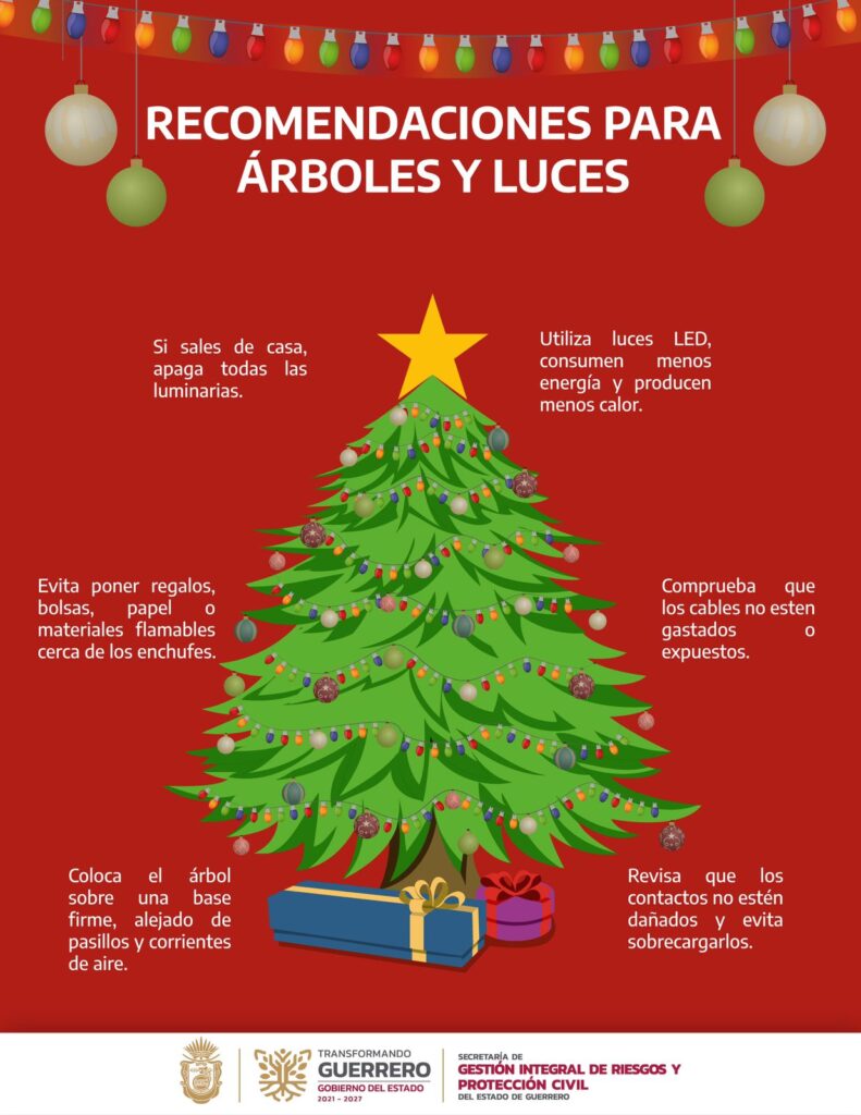 Chilpancingo, Gro., 04 de diciembre del 2022.- Ante el inicio de las festividades decembrinas, la Secretaría de Gestión Integral de Riesgos y Protección Civil, emitió una serie de recomendaciones preventivas a la población, para prevenir todo tipo de accidentes en viviendas, derivado del uso de luces navideñas y otros artículos decorativos de la temporada.