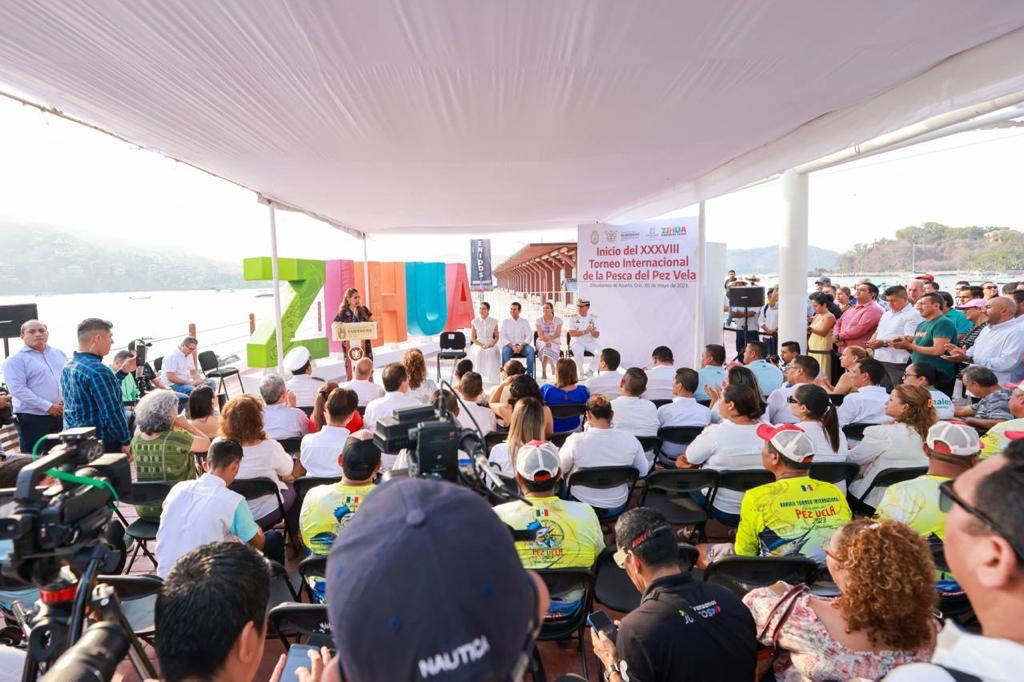 Zihuatanejo de Azueta, Gro., 05 de mayo de 2023.- “Las grandes transformaciones se logran trabajando todos los días sin descanso”, señaló la gobernadora Evelyn Salgado Pineda durante la ceremonia del disparo inaugural de la 38 edición del Torneo Internacional de la Pesca del Pez Vela que se realiza en el puerto de Zihuatanejo del 5 al 7 de mayo, y que este año tiene la participación de 350 concursantes, en las categorías Pez Vela, Marlín, Dorado y Catch & Release.