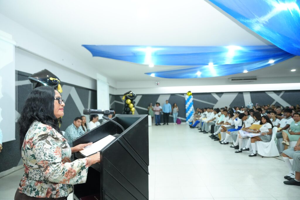 “Los invito a que sueñen, a que esos sueños nobles se cumplan. Estoy aquí con un propósito, jóvenes, si en algo les puedo ayudar, yo estoy aquí como su madrina de graduación. Agradezco la alta distinción que me han hecho, pero también asumo la responsabilidad que significa ser padrino o madrina de generación, si en algo puedo ayudarles aquí estoy, busco que ustedes me tengan confianza, sé que son grandes y sé que pueden”, expresó en la ceremonia de graduación del turno vespertino, momentos después de haber participado también en la clausura del turno matutino.
