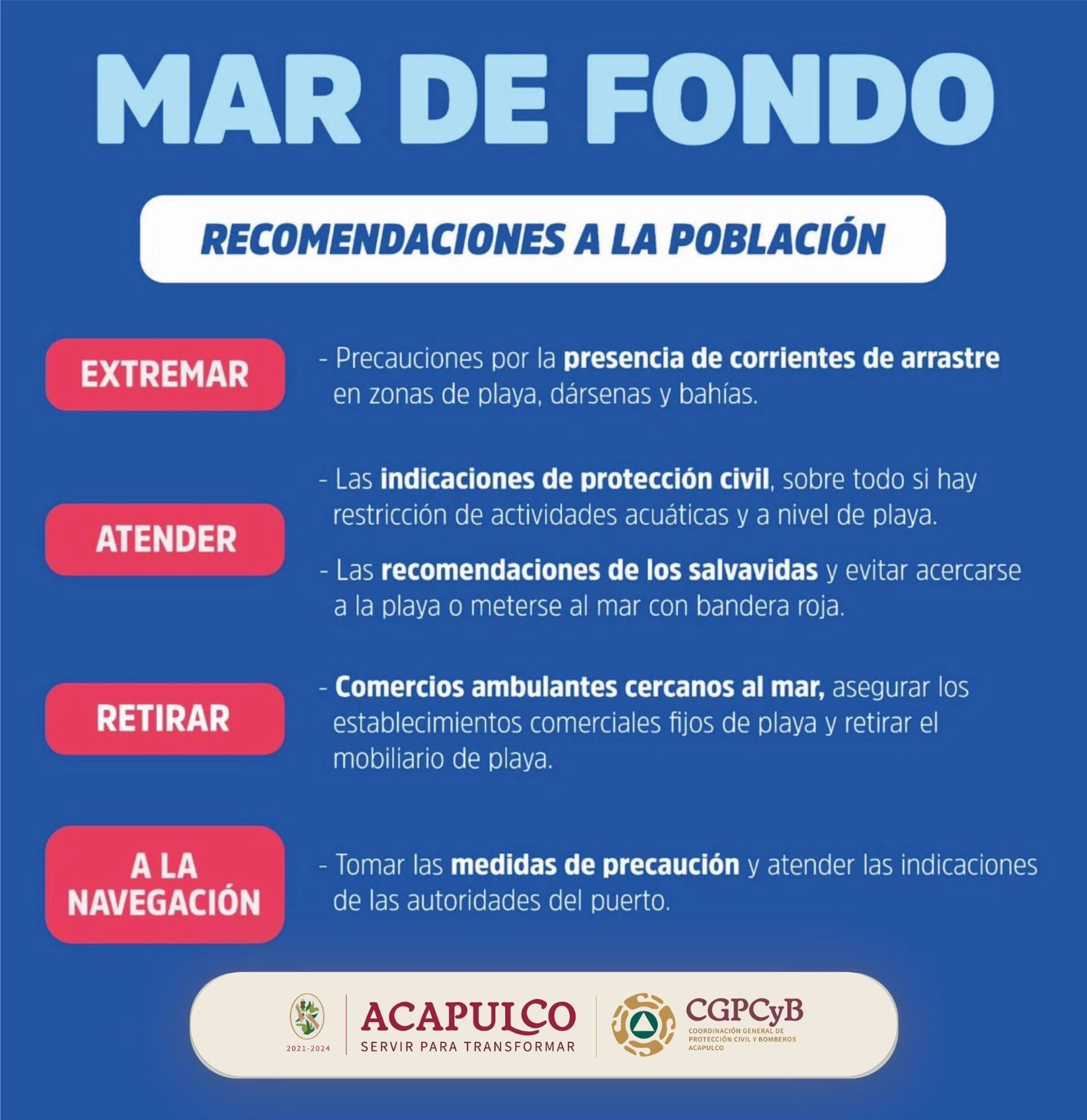 Por lo anterior, se reitera el llamado a la población a mantener precaución en la zona de Barra Vieja, Bonfil, Pie de la Cuesta e interior de la bahía, desde la zona del hotel Elcano hasta playa Hornitos y desde Condesa hasta Icacos, por cambios repentinos de oleaje.