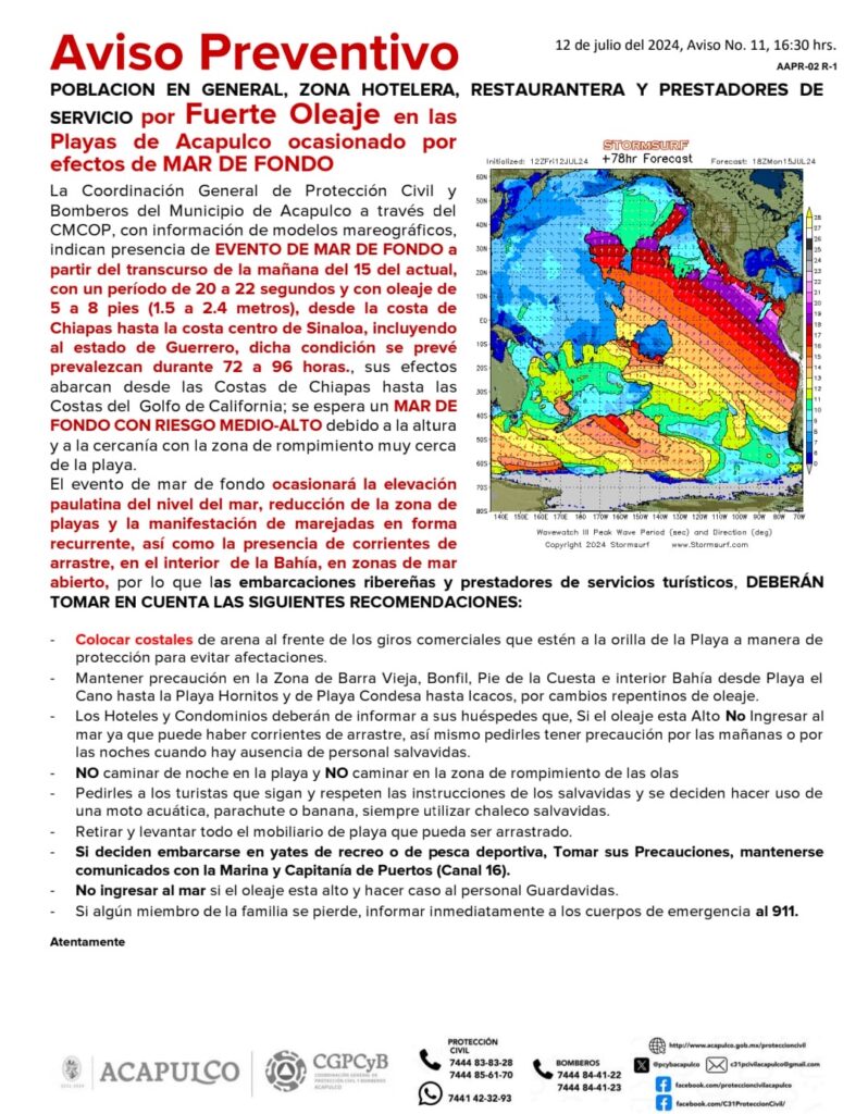 Acapulco, Gro., 12 de julio de 2024- La administración que encabeza la Presidenta Municipal Abelina López Rodríguez, hace el llamado a vacacionistas y residentes a tomar precauciones por fuerte oleaje y mar de fondo.