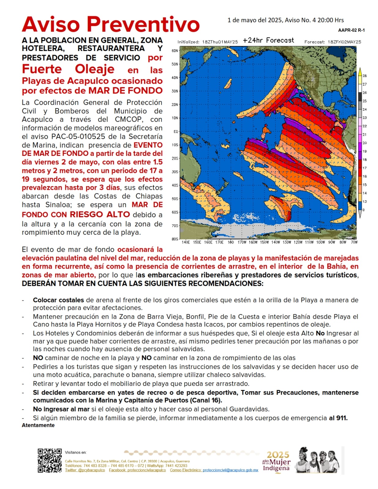 Acapulco, Gro., 01 de mayo de 2025.- El Gobierno Municipal de Acapulco, que encabeza la Presidenta Municipal Abelina López Rodríguez, a través de la Coordinación General de Protección Civil y Bomberos, alerta a la población y visitantes ante la presencia del fenómeno natural de mar de fondo, que afectará las costas de Guerrero.