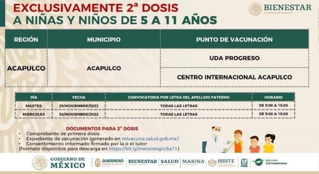 Acapulco, Gro., 28 de noviembre de 2022.– El Gobierno Municipal, encabezado por la alcaldesa, Abelina López Rodríguez, invita a las y los ciudadanos lleven a vacunar contra el COVID-19 a los niños y niñas de 5 a 11 años de edad, el 29 y 30 de noviembre.
