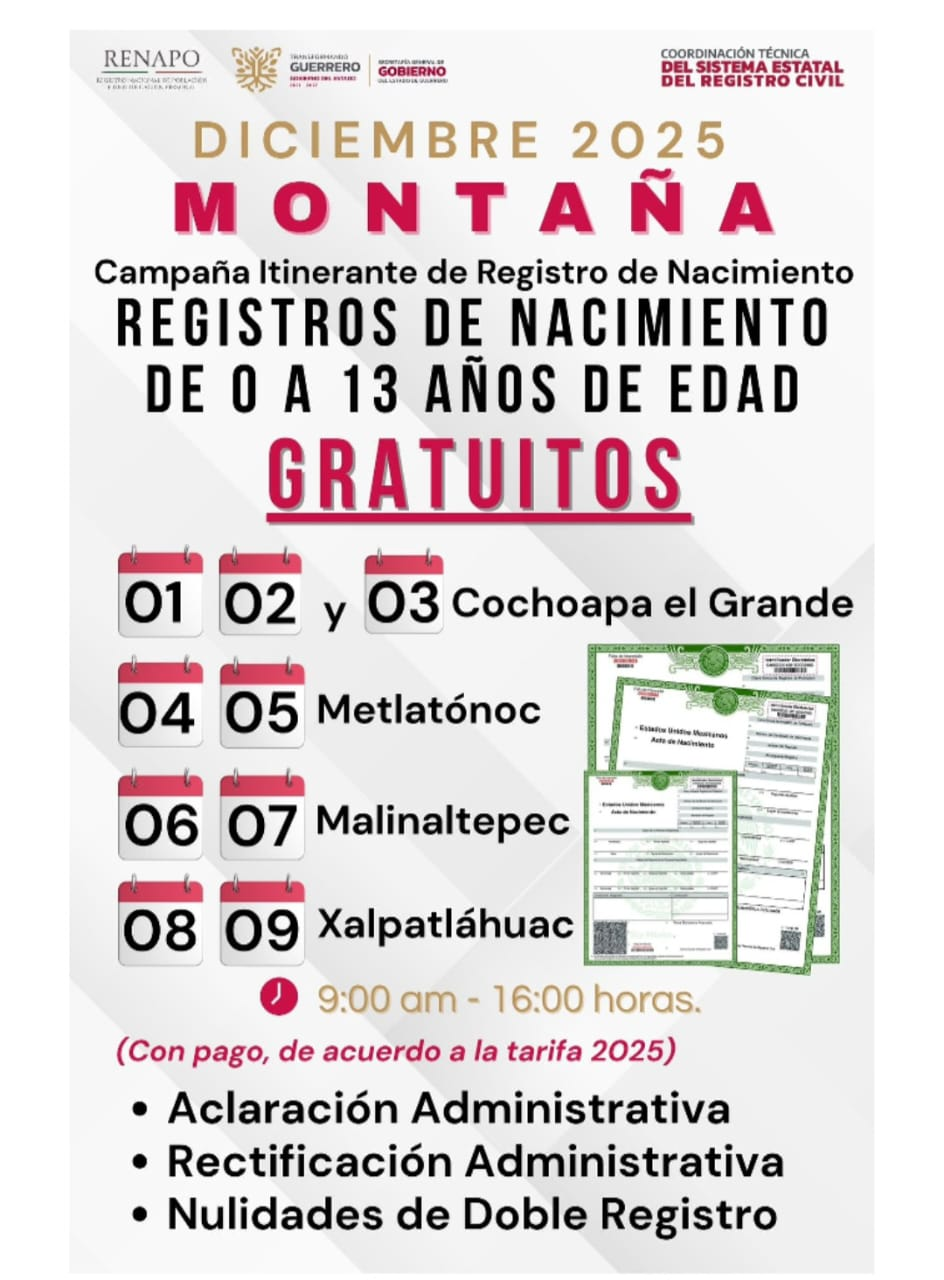 El coordinador técnico del Sistema Estatal del Registro Civil, Carlos Salgado Carranza, explicó que la campaña se realiza el 1, 2 y 3 de diciembre en Cochoapa el Grande; 4 y 5 Metlatónoc; 6 y 7 en Malinaltepec, y 8 y 9 en Xalpatláhuac, con el objetivo principal de abatir el subregistro en comunidades con mayor rezago, realizando registros de nacimiento de niños y adolescentes de 0 a 13 años de edad.