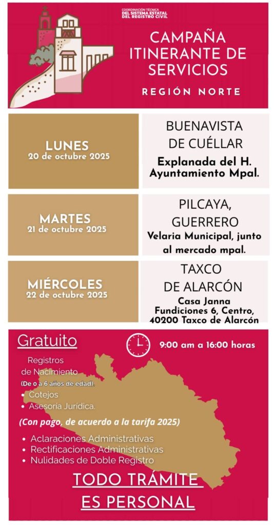 Chilpancingo, Gro., 20 de octubre de 2025.- La Coordinación Técnica del Sistema Estatal del Registro Civil realiza durante esta semana una Campaña Itinerante de Servicios en municipios de la zona Norte del estado, como parte del modelo de cercanía impulsado por la gobernadora Evelyn Salgado Pineda.