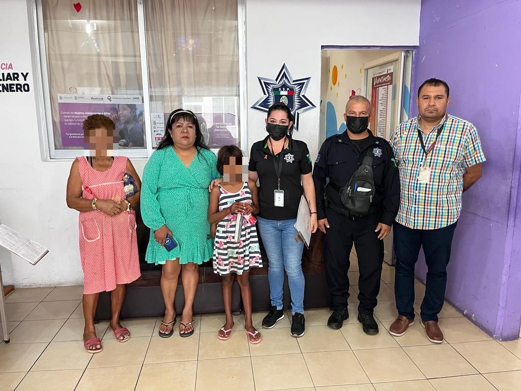 Acapulco, Gro., 21 octubre del 2022.-* Elementos de la Policía Preventiva Urbana atendieron una solicitud de apoyo en la colonia Las Cruces, para resguardar a una menor de ocho años que les entregaron comerciantes del lugar, señalando que se encontraba extraviada, por lo que la trasladaron a la Dirección Especializada para la Atención de la Violencia Familiar y de Género, localizando a los familiares de la niña y entregándoselas en su domicilio.