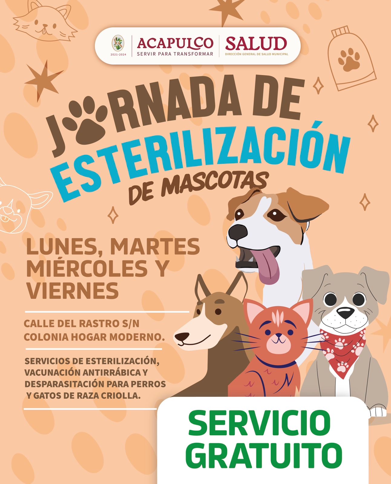 Las y los interesados, pueden llevar a sus mascotas los días lunes, martes, miércoles y viernes a calle del Rastro, sin número, en colonia Hogar Moderno, en un horario de 8:00 de la mañana a 3:00 de la tarde.