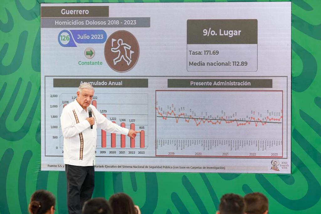 El presidente López Obrador, subrayó que en 2018 se presentaron 2 mil 222 homicidios en Guerrero, mientras que en 2022 se registraron mil 137, lo que muestra una reducción de casi el 50 por ciento, mientras que el secretario de Marina, José Rafael Ojeda Durán, informó en gráficas por entidad federativa, que en la presente administración correspondiente al mes de julio de 2023, Guerrero se ubica, por cantidad total de homicidios dolosos, en el Octavo lugar y por tasa en homicidios dolosos por cada 100 mil habitantes se coloca en el Noveno lugar.