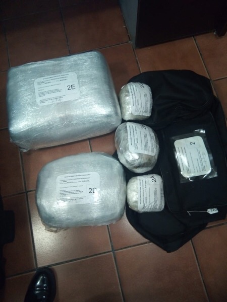 Al abrir el compartimiento del equipaje, se desprendió un olor similar a la marihuana, que provenía de dos maletas, por lo que al abrir una de color negro con gris, se observó en su interior tres paquetes cubiertos con plástico transparente, conteniendo hierba seca color verde con las características de la marihuana y en otra maleta negra, cinco paquetes de diferentes tamaños con el mismo contenido.
