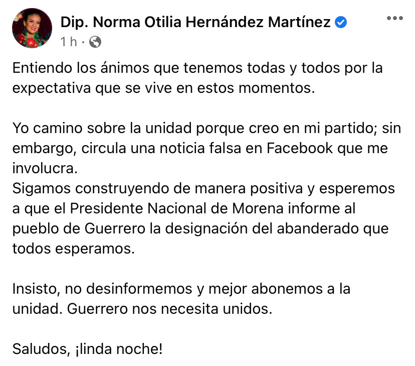“Entiendo los ánimos que tenemos todas y todos por la expectativa que se vive en estos momentos. Yo camino en la unidad porque creo en mi partido; sin embargo, circula una noticia falsa en Facebook que me involucra, no hay tal reunión (en mi casa), pido que sigamos construyendo de manera positiva y esperemos a que el Presidente Nacional de Morena informe al pueblo de Guerrero la información que esperemos” refirió.