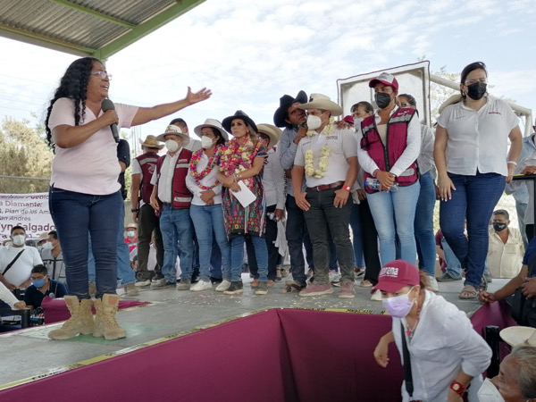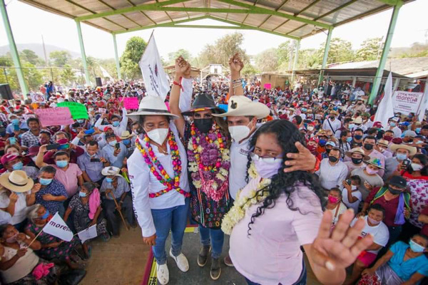 La candidata de Morena al distrito 09 federal, Rosario Merlín García, acompañó a la candidata gobernadora Evelyn Salgado Pineda para pedir el voto masivo de las cuatro boletas del próximo proceso electoral a los habitantes de los pueblos y ejidos de los Bienes Comunales de Cacahuatepec.