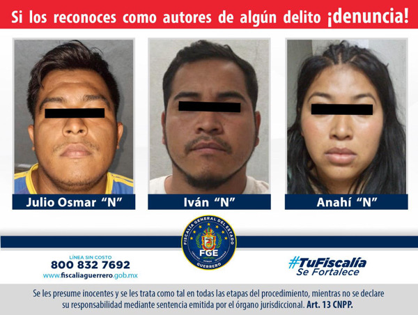 El Ministerio Público adscrito obtuvo del juez prisión preventiva oficiosa en contra de Julio Osmar “N”, Iván “N” y Anaí “N”, como probables responsables del delito de secuestro en agravio de una fémina.