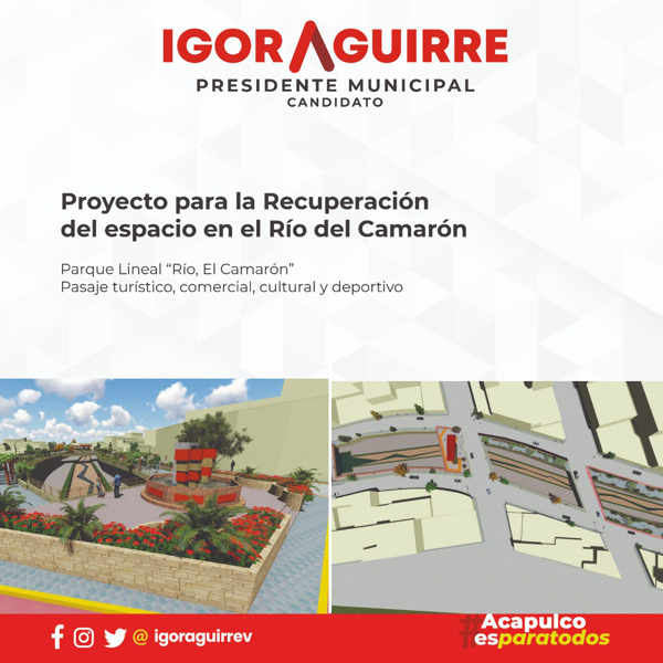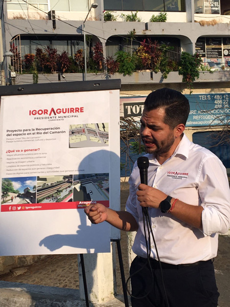 Para “la zona tradicional, una de las más olvidadas por los gobiernos y que le dio el reconocimiento mundial a nuestro puerto, pues en ella brillaban figuras de talla internacional y nacional, hoy presento a mis paisanos acapulqueños este proyecto, que servirá para recuperar los espacios públicos olvidados por nuestros gobernantes”, dijo el candidato del PT a la alcaldia de Acapulco. Igor Aguirre Vázquez,  al presentar en conferencia de prensa su plan de acción para el rescate del río del camarón.