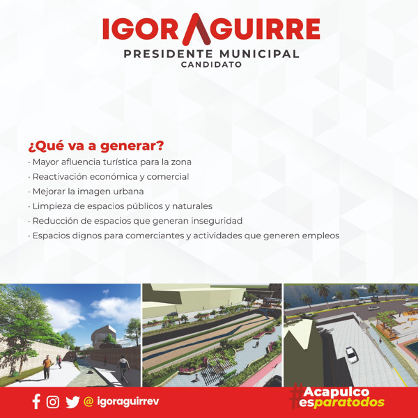 El proyecto está pensado para mejorar la imagen urbana de Acapulco como destino turístico, pero además contribuirá a reactivar la economía de la zona, al generar oportunidades de empleo, reducir la inseguridad y elevar la plusvalía de la misma dijo Aguirre Vázquez, quien señaló que se necesitan más espacios de esparcimiento en el puerto y rescatar aquellos que han sido olvidados por años.