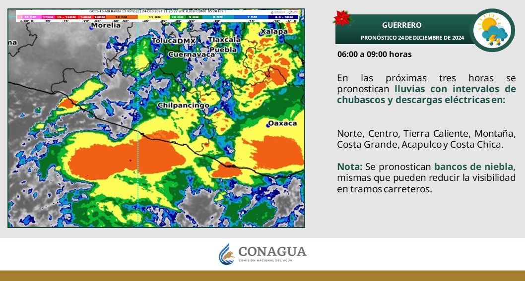 Acapulco, Gro., 24 de diciembre de 2024.- El Gobierno Municipal que encabeza Abelina López Rodríguez a través de la Coordinación General de Protección Civil y Bomberos, informa a la población que se estima, se mantendrán las condiciones de lluvia para Acapulco.