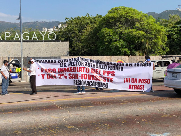 Maestros jubilados y pensionados realizaron una protesta pacífica y bloquearon por unos minutos la costera Miguel Alemán a la altura del asta bandera, para exigir al gobierno del estado el pago del seguro de indemnización del Plan de Previsión Social y el 2 por ciento del SAR-FOVISSSTE.
