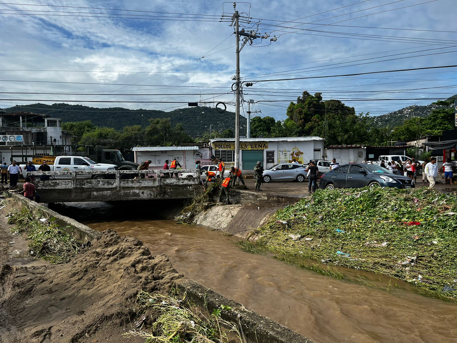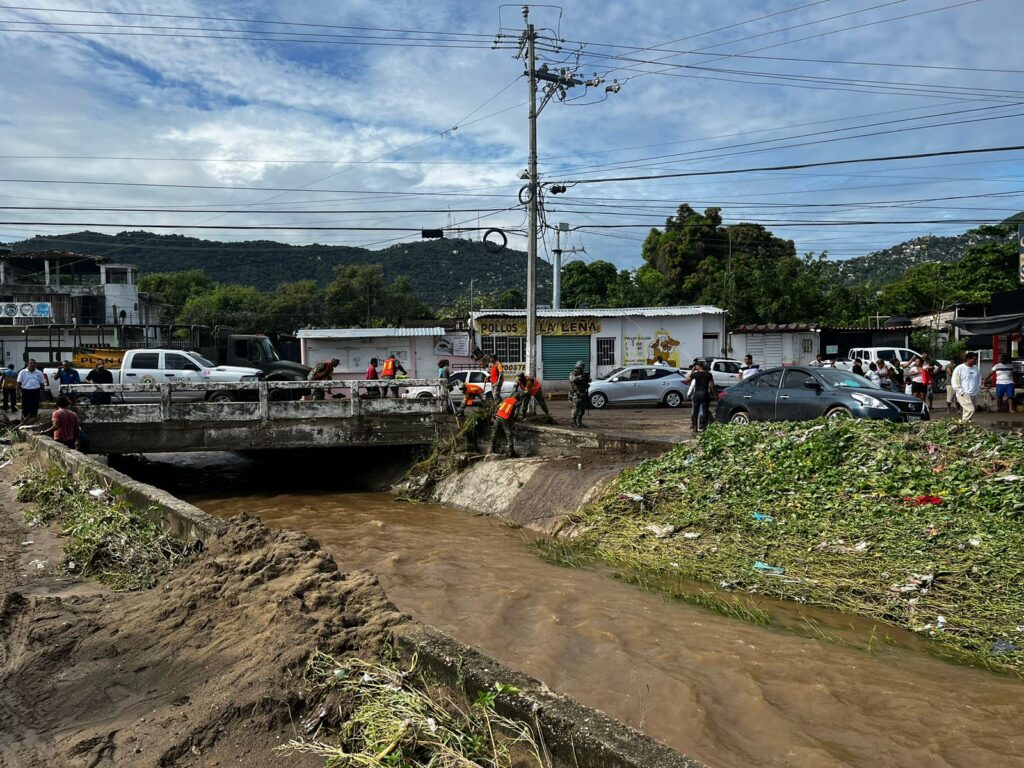 Acapulco, Gro., 10 de octubre de 2023.- Por indicaciones de la Presidenta Municipal, Abelina López Rodríguez, la Coordinación General de Servicios Públicos Municipales, en conjunto con el Ejército Mexicano, realizaron trabajos de limpieza y desazolve en viviendas, vialidades y en los canales del perro y muerto de Playa Seca, los cuales fueron afectados por la Tormenta Tropical “Max”.