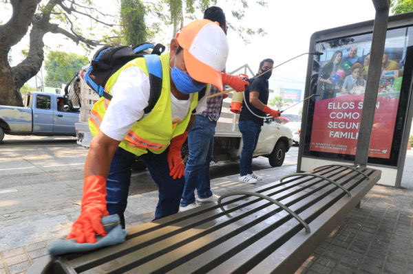 Los trabajos son realizados en paradas de autobuses, casetas telefónicas, postes, bancas, botes de basura, entre otros elementos del equipamiento urbano donde la ciudadanía pudiera tener contacto y contagiarse.