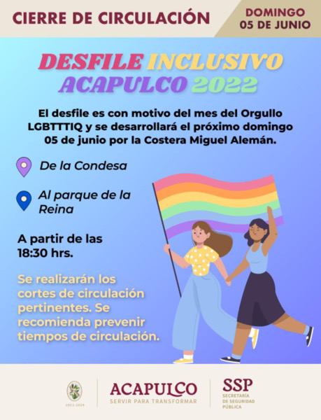 Acapulco, Gro., 04 junio de 2022.- Por la realización del “Desfile Inclusivo Acapulco 2022”, sobre la avenida costera Miguel Alemán, la Secretaría de Seguridad Pública (SSP), recomienda a la conductores prever sus tiempos de traslado, toda vez que se realizarán cortes a la circulación en dicha vialidad en el carril Base-Caleta.