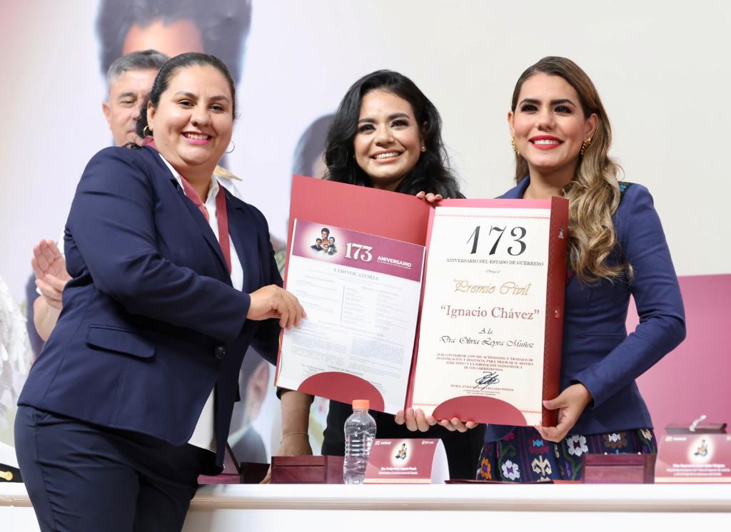 La gobernadora acompañada por los titulares de los poderes Legislativo y Judicial, entregaron la Condecoración Estatal “Vicente Guerrero” al Maestro Bernardo Rosendo Ponce; también entregaron la Condecoración “Juan Álvarez”, a Joel Moreno Temelo y la Condecoración “Ignacio Manuel Altamirano”, fue asignada la Doctora Vera Judith Villa Guardiola, por su valiosa aportación y entrega a los servicios prominentes prestados al Estado de Guerrero.