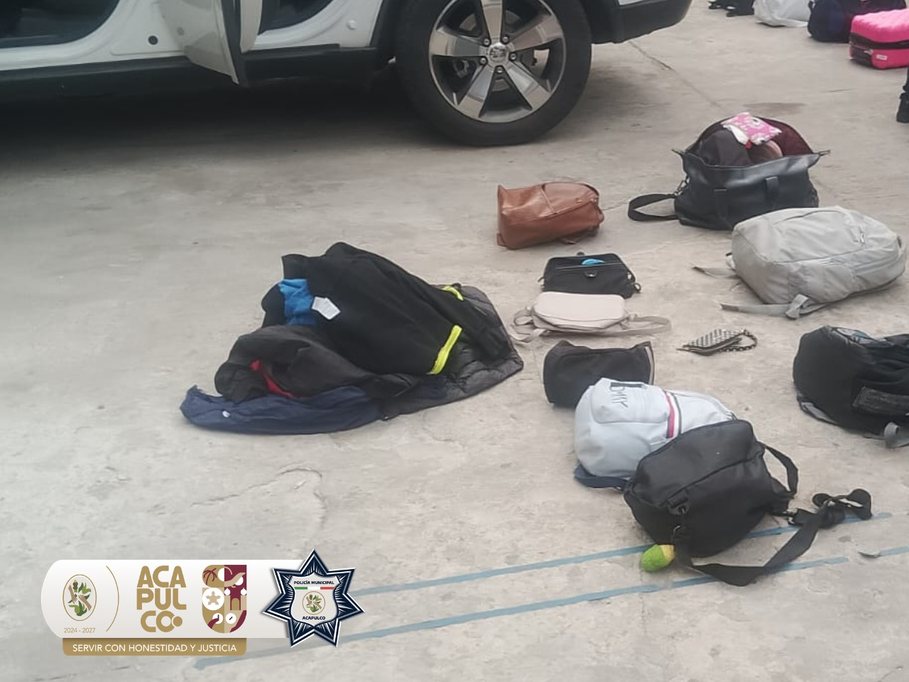 Acapulco, Gro., 26 de abril de 2026.- Elementos de la Policía Vial de la Secretaría de Seguridad Pública de Acapulco (SSP) recuperaron pertenencias reportadas como robadas a turistas y aseguraron a dos hombres presuntamente relacionados con el caso, tras una intervención derivada de un reporte ciudadano en la franja turística.