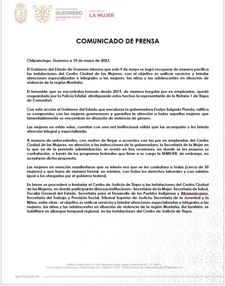 Chilpancingo, Guerrero a 10 de mayo de 2023. El Gobierno del Estado de Guerrero informa que este 9 de mayo se logró recuperar de manera pacífica las instalaciones del Centro Ciudad de las Mujeres, con el objetivo es unificar servicios y brindar atenciones especializadas e integrales a las mujeres, las niñas y las adolescentes en situación de violencia de la región Montaña.