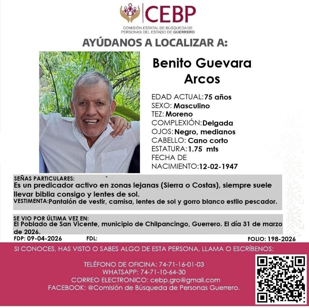 Chilpancingo, Gro., 09 de abril de 2026.– El Gobierno del Estado, a través de la Comisión Estatal de Búsqueda de Personas, activó un operativo de localización y atención tras el reporte de la desaparición de Benito Guevara Arcos, ocurrida presuntamente el pasado 31 de marzo en el poblado de San Vicente, municipio de Chilpancingo.