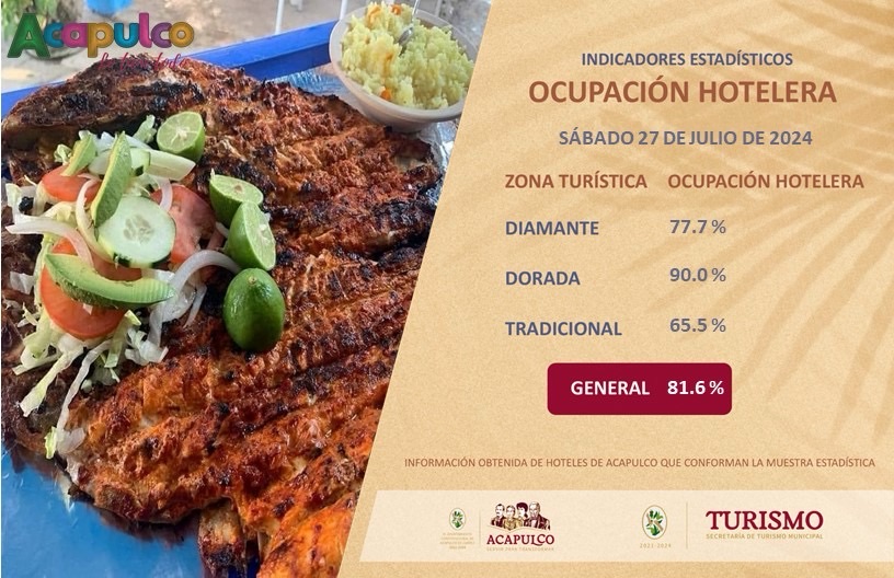Acapulco, Gro., 27 de julio de 2024.- El Gobierno Municipal de Acapulco que encabeza Abelina López Rodríguez, a través de la Secretaría de Turismo, informa que este sábado el puerto de Acapulco alcanzó una ocupación hotelera promedio general de 81.6 por ciento.