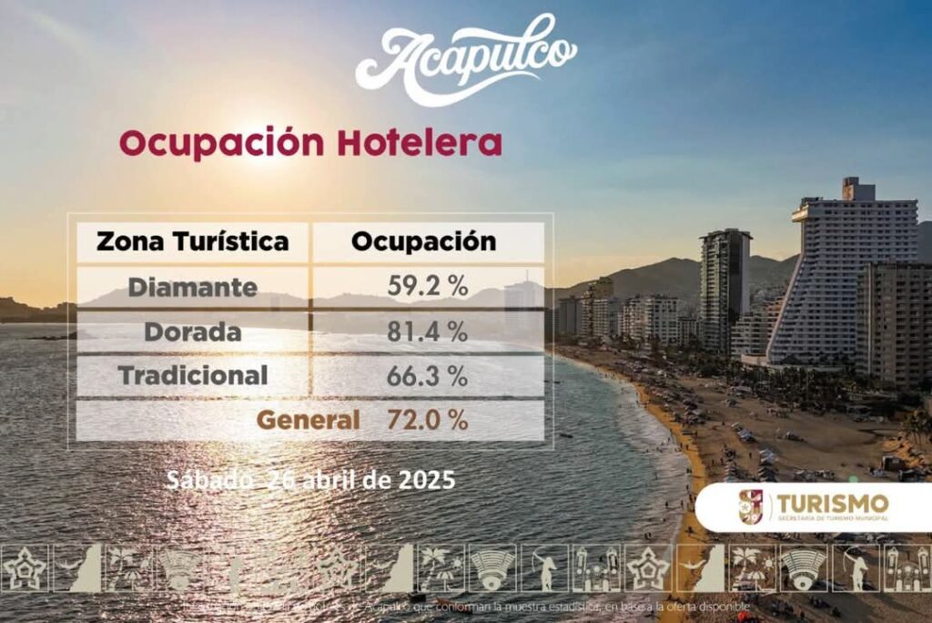 De acuerdo con las estadísticas de la dependencia municipal, dividido por zonas, el Acapulco Dorado se registra una afluencia de visitantes de 81.4 por ciento; seguido de el Acapulco Tradicional o Náutico que reportó 66.3 unidades, mientras que el Diamante mostró el 59.2 por ciento de sus habitaciones ocupadas.