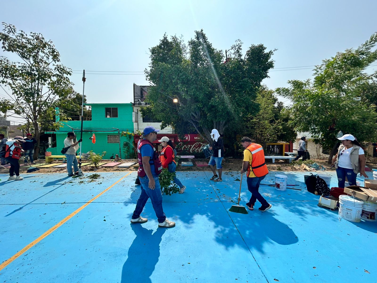 El director de Desarrollo Sustentable David Gaspar Hernández, informó que en esta ocasión, en coordinación con diversas dependencias municipales y federales se llevaron a cabo labores de limpieza, reforestación, mantenimiento y pintura en la cancha ubicada en la colonia Libertadores.